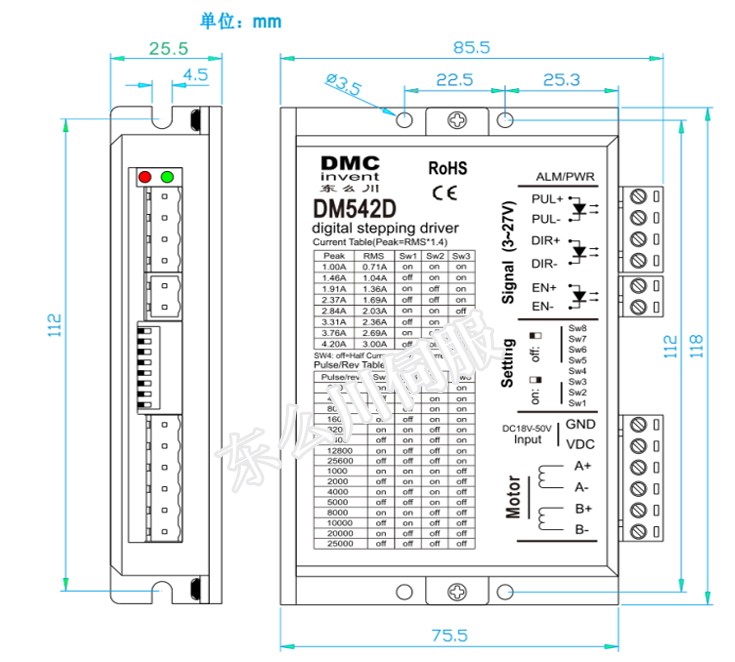 DM542D型驅(qū)動(dòng)器,比DM542A具有更低的電機(jī)發(fā)熱、運(yùn)行噪聲和更高的平穩(wěn)性,以及更低的成本,主要驅(qū)動(dòng)42、57型兩相混合式步進(jìn)電機(jī)。其微步細(xì)分?jǐn)?shù)有15種,最大步數(shù)為25000Pulse/rev;其工作峰值電流范圍為1A-4.2A,輸出電流共有8檔,電流的分辨率約為0.45A;具有自動(dòng)半流,過(guò)壓和過(guò)流保護(hù)等功能。本驅(qū)動(dòng)器為直流供電,建議工作電壓范圍為24VDC-36VDC,電壓不超過(guò)50VDC,不低于20VDC。